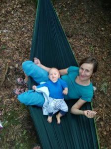 Na hamaku 🙂 Hamak (o ile jedziemy do rejonu gdzie są drzewa) – bo fajnie jest samemu odpocząć, a i dziecko łatwiej usypia z nami na hamaku. W dobrej cenie można znaleźć takie materiałowe hamaki (dobrze się pakują) w Decathlonie.
